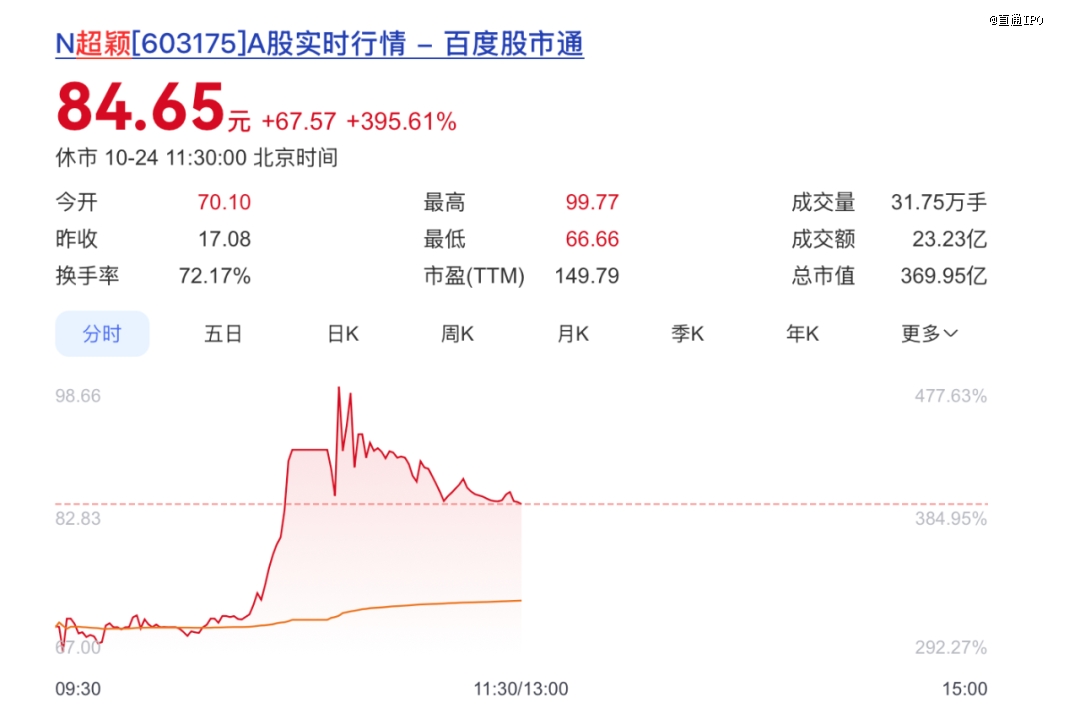 开盘,超颖电子暴涨310.42%报70.1元/股,总市值306.4亿元。截至午间休市,超颖电子涨395.61%报84.65元/股,总市值369.95亿元,盘中最高达99.77元/股。